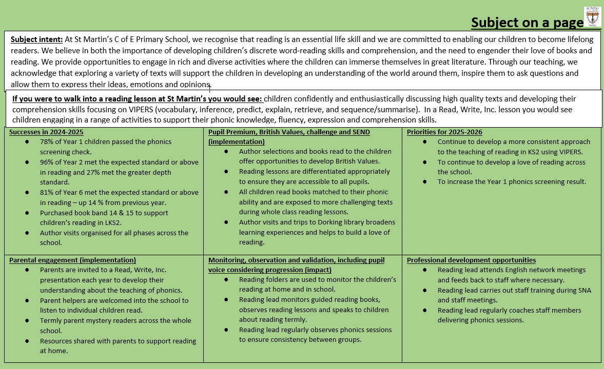 At St Martin’s C of E Primary School, we recognise that reading is an essential life skill and we are committed to enabling our children to become lifelong readers. We believe in both the importance of developing children’s discrete word-reading skills and comprehension, and the need to engender their love of books and reading. We provide opportunities to engage in rich and diverse activities where the children can immerse themselves in great literature. Through our teaching, we acknowledge that exploring a variety of texts will support the children in developing an understanding of the world around them, inspire them to ask questions and allow them to express their ideas, emotions and opinions.